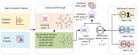 Therefore, this paper first selected a target node and obtained the similarity matrix X between the node and the other nodes by heat kernel [30] calculations. According to the similarity, K nodes with the closest attributes were selected from high to low. Each node represents the cellular traffic data in a region (for example, the Milan dataset used in this paper divided Milan into a 100 100 matrix; so, the number of nodes was 10,000). The cellular traffic data of these K nodes was extracted and rearranged into a L K matrix, namely KNN spatio-temporal matrix B, where K is the number of the most similar K nodes and L is the length of the time series. Then, the number of BS, POIs, and SAs in the region corresponding to these K nodes was extracted to form three 1 K matrices, namely matrix Mb, matrix Mp, and matrix Ms. According to the correlation of the multi-modal features, as shown in Figure 1a, the matrix of each multi-modal feature was assigned the corresponding weights , , and . The matrices Mb, Mp, and Ms were multiplied by the corresponding weights, and then the multi-modal feature matrix C was obtained by adding them, and it was spliced with the KNN spatio-temporal matrix B to obtain a (L 1) K matrix, that is, the matrix S.