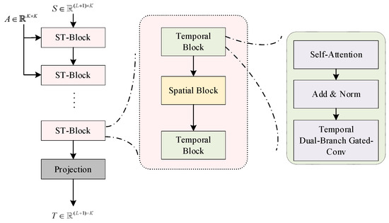 In this section, we provide a detailed description of the architecture of DBSTGNN-Att, which was named dual branch spatio-temporal graph neural network with an attention mechanism. DBSTGNN-Att comprised multiple ST-Blocks (two ST-Blocks were used in this paper). Each ST-Block contained two temporal blocks and a spatial block. Matrix P was fed into the temporal block, while the attributed KNN graph was fed into the spatial block. This setup allowed for the extraction of spatio-temporal features from the cellular network traffic. The prediction results Q were ultimately generated through the projection layer. Figure 3 illustrates the structure of DBSGTNN-Att, where the parameter L represents the historical time-series length. The dimension of the matrix S obtained by splicing the multi-modal feature matrix with the attributed KNN matrix was , where K is the number of similar nodes extracted and L is the length of the historical time series.
