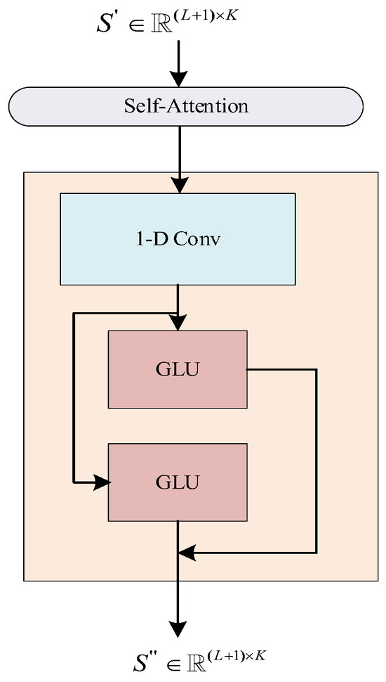 Moreover, the 1-D Conv layer divides the matrix into two segments on average, namely and . Each segment then separately undergoes processing through two GLUs (gated linear units), after which their respective outputs are combined. The output of the two GLUs is fused to obtain . This approach offers an advantage by enabling different GLUs to concentrate on learning distinctive feature representations of various components, thereby augmenting the model’s ability to adapt to disparate data models. In the context of predicting cellular network traffic, the traffic patterns may potentially vary due to temporal, geographical, or other contextual factors. Therefore, the adaptability of the model becomes pivotal. The related equations are shown in Equations (4)–(8).