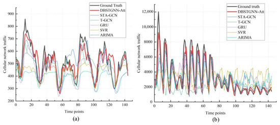 Prediction performance display of cell No. 4259 for different sampling intervals, with each time point representing a sampling interval, for a total of 144 time points. (a) Short-term prediction: 10-min sampling interval; and (b) mid-term prediction: 30-min sampling interval.