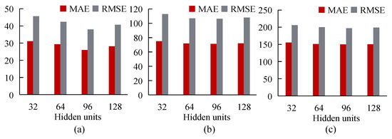Performance comparison under different hidden units. (a) A 10 min sampling interval; (b) a 30 min sampling interval; and (c) a 60 min sampling interval.