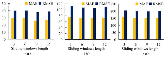 Performance comparison under different sliding window lengths. (a) A 10 min sampling interval; (b) a 30 min sampling interval; and (c) a 60 min sampling interval.