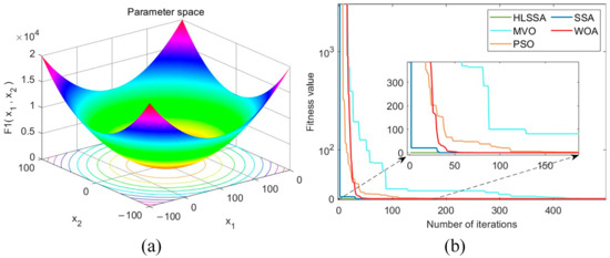 Convergence accuracy analysis: As depicted in Table 3, using the HLSSA, we successfully determined the optimal values for test functions F1 to F4. Although they did not reach the optimal values for F5 to F7, the algorithm’s performance in terms of the obtained optimal values, averages, and standard deviations was significantly better than the PSO, MVO, WOA, and SSA. This indicates that the HLSSA has stronger optimization capabilities when solving unimodal test functions.