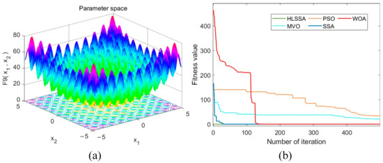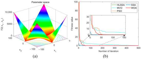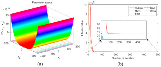 Table 5 presents the optimization results for the five algorithms, and Figure 9, Figure 10, Figure 11, Figure 12 and Figure 13 depict the three-dimensional plots and convergence plots for the five test functions. In Figure 9a, Figure 10a, Figure 11a, Figure 12a and Figure 13a, n = 2 for the purpose of displaying the two-dimensional surface of the functions. In the results shown in Figure 9b, Figure 10b, Figure 11b, Figure 12b and Figure 13b, the value of n is 30.