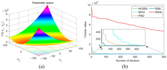 (a) Three-dimensional plot of F3; (b) convergence curve.