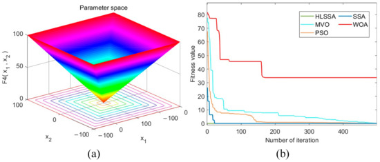 (a) Three-dimensional plot of F4; (b) convergence curve.
