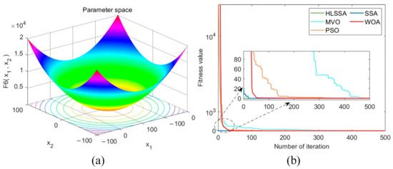 (a) Three-dimensional plot of F1; (b) convergence curve.