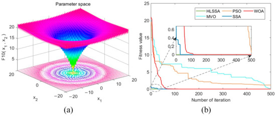 (a) Three-dimensional plot of F10; (b) convergence curve.