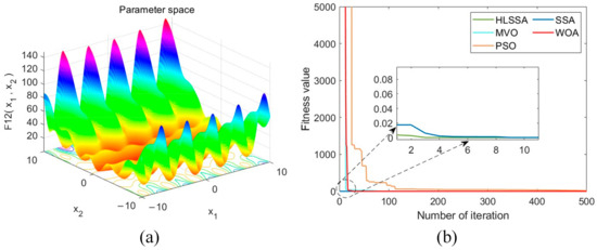 (a) Three-dimensional plot of F12; (b) convergence curve.