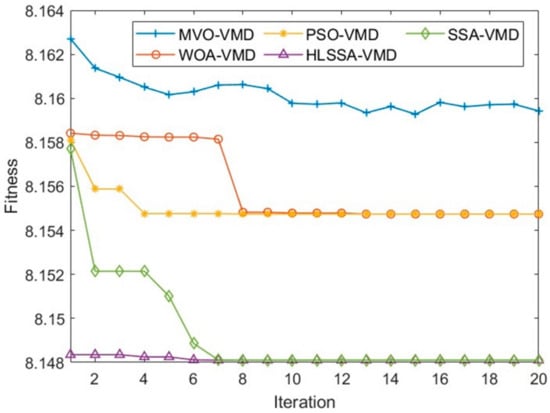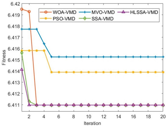 This comparative analysis further validates the outstanding performance of the HLSSA in optimizing VMD parameters, showcasing its faster convergence speed and higher-quality decomposition results.