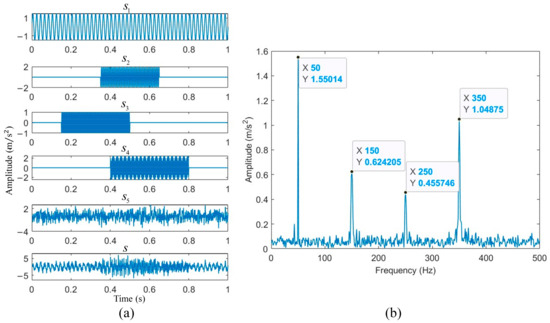 Figure 16a is a visual representation of each simulated signal. Signal had an amplitude of 1.5, a frequency of 50 Hz, and a duration of 0–1 s; signal had an amplitude of 2, a frequency of 150 Hz, and a duration of 0.35–0.65 s; signal had an amplitude of 1.5, a frequency of 250 Hz, and a duration of 0.15–0.5 s; and signal had an amplitude of 2.5, a frequency of 350 Hz, and a duration of 0.4–0.8 s. Figure 16b shows the amplitude–frequency plot obtained by performing a Fourier transform on the synthesized signal s. Figure 16b demonstrates that the synthesized signal s contained the frequencies corresponding to the simulated signals .