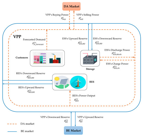 However, based on advanced information, communication technology, and control systems, VPP can now integrate many RES, ESS, and loads, so its size becomes large. In addition, due to the advantages of ESS, such as a fast response time, a high ramp rate, and the ability to adjust power output up or down flexibly [28,29,30], VPP can easily meet the BC market’s requirements and become an active reserve provider. Thus, in VPP operations, ESS plays a considerable role. In coordinating resources and customers within VPP, ESS compensates for the difference between the predicted and actual power of RES and demand. In the DA market, ESS will store electricity during low-priced hours and discharge during high-priced hours; consequently, VPP can profit from energy arbitrage. In the balancing market, ESS is also an effective source, providing a part of VPP’s upward/downward reserve. A proper optimal scheduling model can ensure that ESS performs well in the above roles. Unfortunately, in recent studies, the role of ESS has not been emphasized. In [31,32,33,34,35], VPP acts as a reserve provider (RP) that always holds a part of its capacity available to make adjustments if needed. In [36], the authors propose a trading strategy in which VPP can be both passive and active agents to get more profit based on the dual-price formation of the balancing market. However, in these studies, the VPP’s upward/downward reserve provision ability is almost based on the capacity adjustment of RESs and flexible demand. As in [37,38], VPPs provide peak shaving and valley filling services for a distribution system, where providing peak regulation service is the ESS’s sole role.