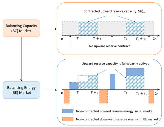 In power systems worldwide, balance management plays an essential role. Accordingly, the transmission system operator (TSO) must maintain the real-time balance between total production and consumption to maintain frequency and stabilize power system operation. Therefore, the customers’ consumption, as well as the available power output of traditional power plants and RESs, need to be forecasted and planned in advance via the DA market. Unfortunately, imbalances still occur due to unexpected events such as unplanned generator outages or load and RES forecasting inaccuracies. Then, TSO is responsible for correcting the imbalances via the balancing market, which includes two phases: BC market and BE market [43,44,45]. Normally, RPs should predetermine and submit their reserve capacity bids to TSO, and then the BC market is cleared several months to at least one day before the operating day. Closer to real-time, TSO activates balancing energy automatically or manually in the BE market if an imbalance occurs. Interestingly, reports [25,43,44,45,46,47] show that the BC markets in most countries only consider upward reserve capacity. By contrast, in the BE markets, the RPs can not only be called to provide upward reserve but also offer their downward reserve energy. This allows the RPs to obtain more profit from the balancing market.