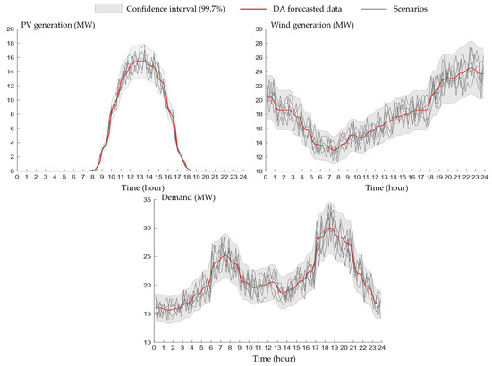 In Figure 6, the red lines illustrate the typical daily profile curves of PV, WP, and demand, treated as the day-ahead forecast data. The light gray areas describe 99.7% confidence intervals of forecast data, assuming that the forecast errors of all resources and customers follow the normal distribution with means of 0 and standard deviations of 5%. With these forecast data, ten scenarios are generated as follows: