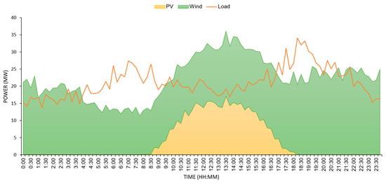 Base case: The daily curves of PV, WP, and demand in the highest probability scenario of uncertain parameters.