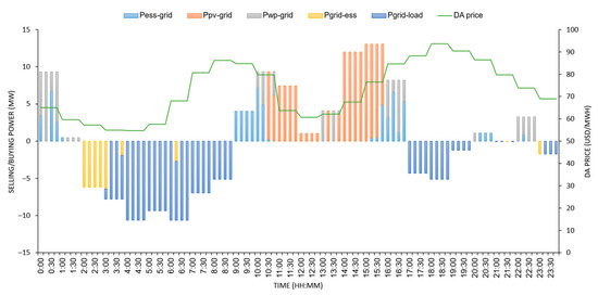 | ESS energy in the DA market at time t in scenario S (MWh). | |