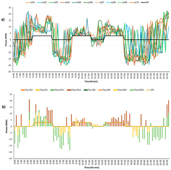 The CVPP’s upward/downward reserve energy can be provided by RESs and ESSs (Figure 1). Among these sources, ESS is an effective reserve provision source because it can flexibly increase or decrease charging/discharging level, switch from charging to discharging status, and vice versa. However, unlike other resources, activating the ESS’s reserve provisioning ability not only increases/decreases its charging/discharging power but also changes its stored energy level. Note that in the CVPP’s structure, ESS is also involved in taking advantage of RES’s available power output and leveraging energy arbitrage opportunities in the DA market. For this reason, the ESS reserve provision may be limited to not affecting the operating plan submitted in advance in the DA market.