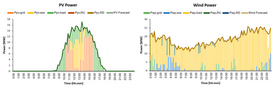 In this section, the CVPP’s optimal schedule is determined with Plan 1 of the BC contract in Table 2, the probability of activating reserve energy of 1%, and other input data given in Section 4.1. Figure 8 presents daily PV, WP, and demand curves in the highest probability scenario. The results are presented in Figure 9, Figure 10, Figure 11, Figure 12 and Figure 13. Note that in the proposed model, the first-stage variables are fixed, while the second-stage variables will change according to the scenarios of uncertain parameters. For simplicity, these figures only represent the second-stage optimal results corresponding to the highest probability scenario with the PV, WP, and load curves depicted in Figure 8.