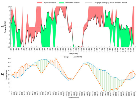 - The association between the ESS’s upward/downward reserve provision ability in the BE market and its scheduling in the DA market, as well as its status switching, is described by Equations (2)–(15).