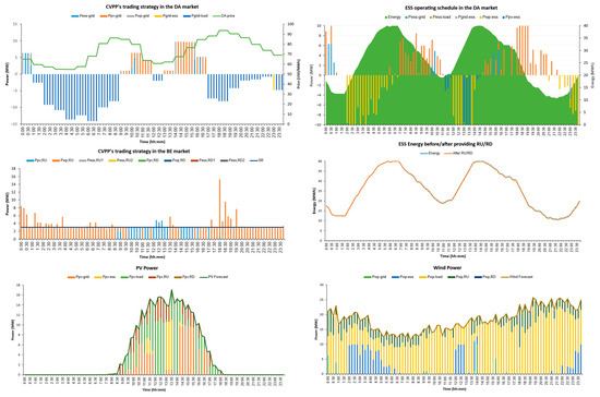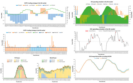 The rest of the paper is organized as follows: Section 2 demonstrates the operating model of VPP in the DA and balancing market, as well as the assumptions used in this paper, thereby presenting the ESS’s reserve provisioning model. Section 3 presents the mathematical formulation of the VPP’s optimal scheduling model in the DA and BE markets. Then, the proposed model is implemented on a test VPP system in Section 4. This section also collects and analyzes the computation results. Finally, Section 5 concludes the paper.
