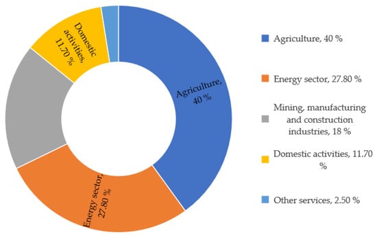 WW can affect aquatic life due to the presence of colored compounds such as various dyes and other colorants in numerous water bodies. The most important content of residual dyes in natural water resources is caused by discharge from major manufacturing industries (Figure 1), such as the textile industry, which is considered to constitute 54% of existing dye-containing effluents in the world [5,6]. The annual growth rate of textile dyes proposed by Global Market Research Future is 8.13% (over 2016–2022) [5]. The economic activities in Europe require ca. 243,000 cubic hectoliters of water per year, according to the Water Exploitation Index (WEI) of the European Environmental Agency (EEA) [1,7]. A high percentage of this water (>55–60%) is returned to the aquatic environment, i.e., more than 140,000 cubic hectoliters per year, but loaded with solid impurities or dissolved pollutants, including dangerous residual chemicals such as persistent colored compounds, as synthetic dyes, emerging compounds, or heavy metals [1,8].