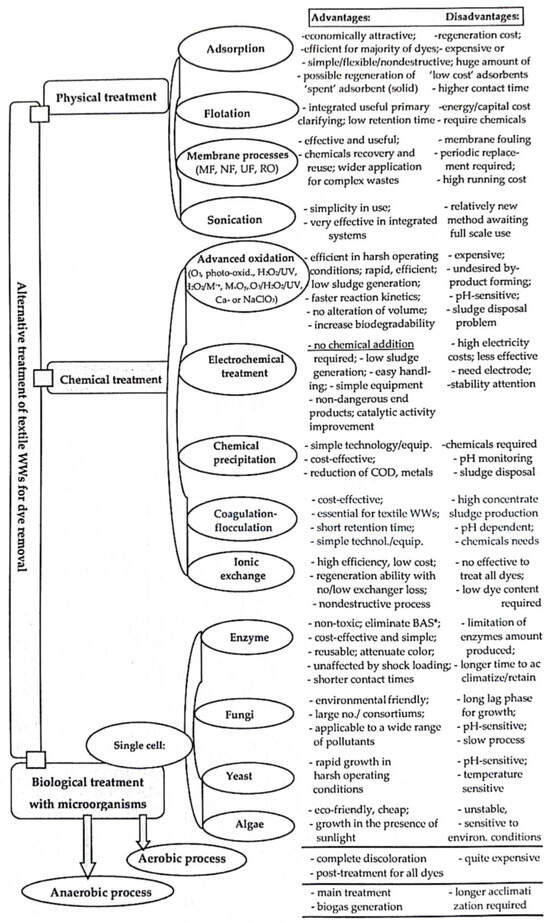 Some treatment processes used for colored WW that are commonly applied to textile effluents are summarized in Figure 2 in association with their principal advantages and disadvantages. Each treatment process has specific constraints considering the treatment cost, feasibility, efficiency, practicability, reliability, environmental impact, sludge production, difficulties in operation and processing, pre-treatment requirements, and the possibility of producing potentially toxic by-products [12,41,42,43].