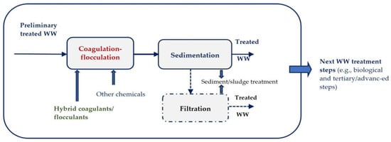 Commonly, the coagulants applied in WW treatments are classified into two groups: synthetic and natural coagulants. To enhance the formation of flocs, the introduction of coagulant aids is sometimes required to increase the density of flocs for better separation via gravity or filtration (rapid/lent), such as different types of clays or mineral materials (e.g., kaolin, bentonite, montmorillonite) that improve the mechanical separation of suspended solids from WW after an adequate stirring regime as well as WW discoloration treatment. This is one of the main reasons for the application of hybrid materials as coagulant–flocculants, which have higher densities due to the multiple materials present in their composition (inorganic, organic, natural biopolymers, etc.) that permit the improved removal of suspended solids and dissolved colored species from WW. Good S/WW separation improvements in terms of sedimentation (>20–50%) and discoloration (>10–35%) were achieved, especially in the case of treated effluents from beverage industries, local small wine manufacturing, textile or cosmetic industries, and municipal WWs associated with improved sedimentation and multiple filtration layers (rapid multiple-bed filtration) or biofiltration.