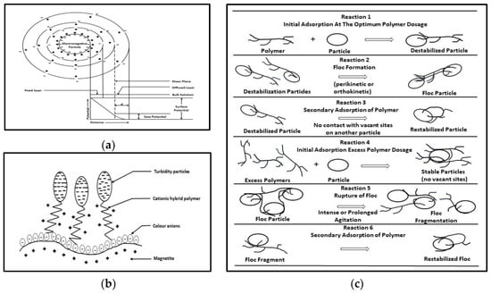 Schematic representation of coagulation–flocculation mechanism. (a) Electric double layer of a colloidal particle; (b) interaction mechanism between colloids, colored species, and polymer-based coagulants; (c) flocculation mechanism with polymer-based hybrid materials [95,96,150].
