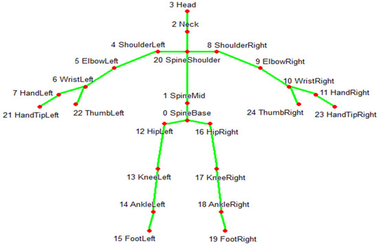 Figure 2 shows the skeletal system structure that can be obtained from the Kinect sensor. In this study, after creating the test setup, we predicted that the data from joints 0, 3, 15, and 19 in Figure 2 could carry the appropriate characteristics for the system requirements. However, after the experiments, the data from limbs 0 and 3 caused incorrect responses. These limbs may have remained in front or behind when the person bended or jumped. As a result, the best coordinates were obtained from the right and left foot joints numbered 15 and 19, respectively. In this way, the margin of error between the data received from the sensor and the position of the person in the game was reduced to ±8 cm.