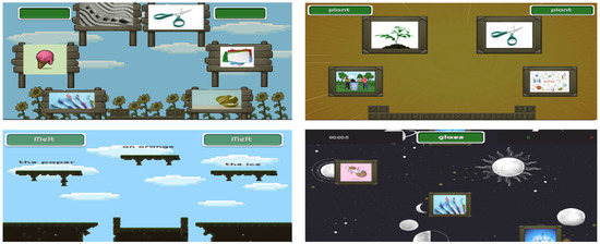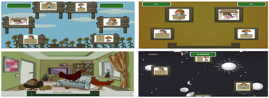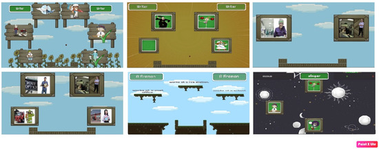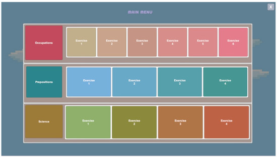 The software interface (Figure 3) was designed to be quite simple and plain in order to be user-friendly. When the software is started, the entire curriculum and the activity content of the curriculum are listed. As explained in Table 2, the program includes a total of 13 different activities belonging to 3 different topics. High-frequency and low-decibel background music (jazz and/or classical) was added to the games to contribute to people’s attention and focus. Figure 4, Figure 5 and Figure 6 depict the interface of the activity-based games belonging to professions, prepositions, and science sections. Table 2 shows the vocabulary and sentence groups determined as the outcomes of these sections.