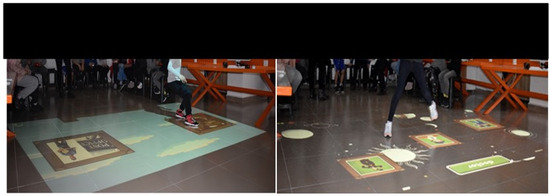 Figure 7 shows the physical environment where the system was implemented in the pilot school. The system allows one user to six users to perform the activities simultaneously. Thus, the level of entertainment was increased by creating competition among students. Also, there are different levels in the games, and the activity levels can be adjusted according to the level of the student, from easy to difficult. Similarly, the duration and difficulty level of the games can be adjusted by the teacher according to the level of the students.