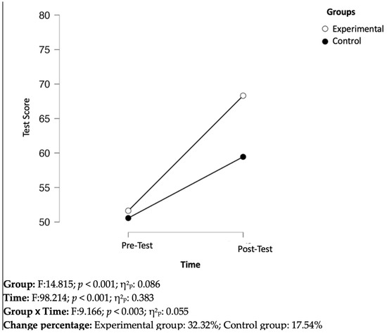 Figure 8 shows a significant difference between the repeated measurements of the experimental and control groups in terms of Group: F: 14.815, p < 0.001, η2p: 0.086; Time: F: 98.214, p < 0.001, η2p: 0.383; GroupxTime: F: 9.166, p < 0.003, η2p: 0.055. Although the Bonferroni (post hoc) test showed no significant difference between the experimental and control groups in the pre-tests (<0.10), a significant difference was found in favor of the experimental group in the post-tests (68.317 ± 8.033 vs. 59.450 > 8.670). Furthermore, there was a significant increase in the post-tests compared to the pre-tests (p < 0.001) in both groups ((experimental group pre-test: 51.634 ± 6.647 vs. post-test: 68.317 ± 8.033), (control group pre-test: 50.575 ± 9.279 vs. post-test: 59.450 ± 8.670)); however, the groupxtime interaction results revealed that the experimental group showed a higher increase in percentage (32.32% vs. 17.54%) compared to the control group.