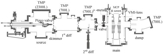Since the spectrometer was detailed in ref. [], we provide only a summary here. Figure 1 shows a diagram of the spectrometer. It consists of five chambers: (i) the source chamber, (ii) the first differential chamber, (iii) the second differential chamber, (iv) the main chamber, and (v) the jet dump chamber. A piezo valve (Amsterdam Cantilever ACPV2, Amsterdam, The Netherlands) [] with a pinhole of 100 μm diameter is installed to produce a supersonic molecular beam in the source chamber. The piezo valve backing pressure is set at 1.0 bar. After passing the 1st and the 2nd differential chambers equipped with 1 mm diameter holes, the molecular beam enters the main chamber of the VMI spectrometer, where it encounters either the X-ray photon or femtosecond laser. The diameter of the gas jet is estimated as 1.2 mm according to the mechanical structure. A double-layered -metal shield is installed to reduce the residual magnetic field at the interaction region to 8 mGs. Particles from the interaction region are focused by the lens system onto the two vacuum imaging detectors (VID275) from Photek, East Sussex, UK.