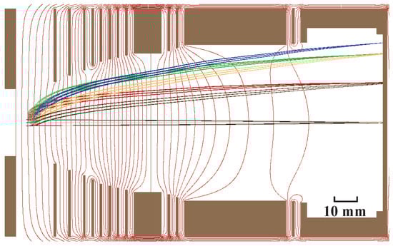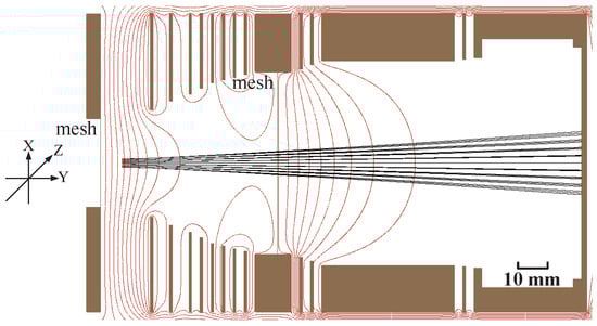 Simulation of the spatial mapping mode with a scale factor of 7.6. The source region is defined as 1 × 3 mm2. The black lines represent the trajectories of the ion and the red lines represent the equipotential curves of the electric field.