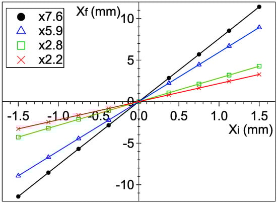 In order to check the linearity in the magnification, we plot the final position  against the initial position  in Figure 3 for all the magnification factors. Then, we fit each data set with a function: