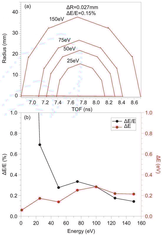 Figure 5a summarizes the simulation from Figure 4. The radius is plotted as a function of TOF for electrons with different kinetic energies. To obtain the simulated relative resolution, we calculated the average radius R and the maximum radius difference  of the nine particles on the detector’s surface at an emittance angle of 90°. Then, the relative energy resolution is calculated as . Figure 5b demonstrates the relative energy resolution at electron energies ranging from 0 to 150 eV in high-resolution momentum mapping mode. All the electrons at different kinetic energies and emission angles are nicely focused.  depends weakly on the electron energy. The best relative energy resolution of 0.15% is predicted at 150 eV, which is the highest kinetic energy.
