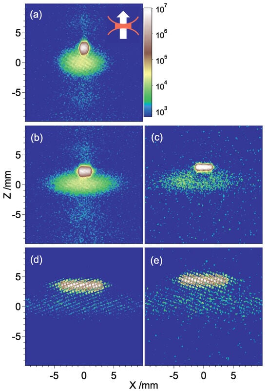 We capture spatial mode ion images, as shown in Figure 6. The absolute size is determined with reference to the 80 mm diameter of the phosphor screen. As indicated by the inserted diagram in Figure 6a, the supersonic molecular beam propagates up while the laser propagates to the right side. Through the adiabatic expansion, the supersonic molecular beam is cooled down to about 10 K with a mean speed higher than the room-temperature thermo-speed. In comparison, the residual gas is at room temperature. The laser is focused with a Rayleigh length of 4 mm and a beam waist of 68 μm. The diameter of the Ar jet is 1.2 mm. Upon interaction between the laser and Ar jet, the produced Ar+ ions are characterized by narrow velocity distribution and compact shape in the acquired image, shifting from a more dispersed image from the residual gas. So, the spot or narrower stripe with higher intensity in each subplot is attributed to Ar+, while the weaker and broader stripe is attributed to the ions from residual gas. It should be noted that since the ions from residual gas move isotropically, their image represents the reaction center better than the ion image from the jet does.