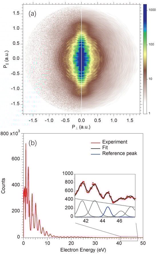 To obtain the instrument’s resolution, we fit ATI peaks between 40.7 and 47.9 eV with Gaussian functions, as depicted by the black line in the inset of Figure 7b. As shown by Nandor et al. [], the width of peaks at the plateau region may change. So, the fitting parameters are the peak width and height. A narrow ATI peak near 44.6 eV is chosen, and its full width half maximum (FWHM) is determined as 0.66 eV in the least square fitting. This width is contributed by the intrinsic width of the ATI peak and the instrument resolution. According to theoretical calculations [], the intrinsic width of this ATI peak is about 0.3 eV. So, the energy resolution of the spectrometer is estimated as  eV, corresponding to 1.3% at 44.6 eV electron kinetic energy.