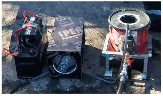 For cavitational vortex milling of carbon black, a laboratory apparatus was constructed, as illustrated in Figure 1. The heart of the system is a Flexicone VM150 vortex device (Energystore Group Pty Ltd., Wetherill Park, Australia), featuring a capacity of 150 kg/h and operating at a frequency of 33 kHz. The system was powered by an industrial diesel compressor with a pressure range of 2–3 bar and a flow rate of 3 m3/min. The airflow rate was visually determined to ensure the best quality of the milled product (absence of agglomerated particles; checked using an optical microscope LEICA ICC50 HD (Leica, Wetzlar and Mannheim, Germany), magnification 400 times). The flow rate was adjusted using the control panel of the compressor.