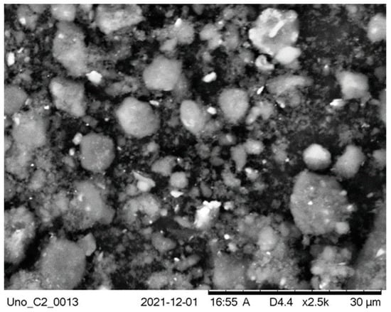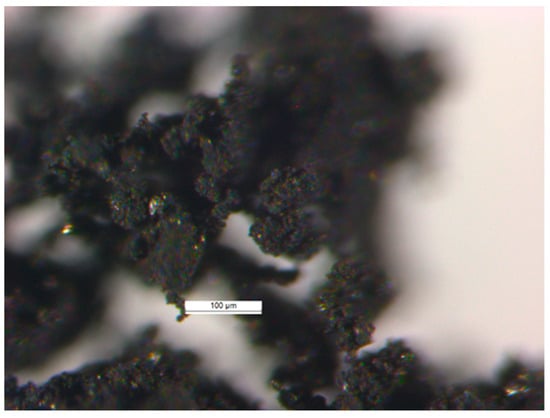 The samples of raw carbon black from the pyrolysis of waste tires provided for the studies by Biopower OÜ (Kunda, Estonia) consisted of black powder whose particles were agglomerated into large clumps with a diameter of up to a few millimeters (Figure 1). The carbon black was produced from shredded waste tires using the apparatus of Jinan Youbang Hengyu Science and Technology Development Ltd. (Jinan, China) As the production of carbon rCB had ceased when we started our study, we could not determine the immediate causes of process disturbances and the resulting low-quality product, but as the solid product contained up to 5% high-molar-mass organic impurities (bituminous substances, etc.) we assume that the operating mode was unstable and the temperature was insufficient for an effective pyrolysis process. The pyrolysis temperature was set at approximately 350–450 °C and the reaction time in the pyrolysis reactor was about 1 h, using an alumosilicate-based catalyst with added ZnO, as provided in the patent EP 2 103 668 A1. After cessation of production, the previous owner left more than 3000 tons of low-quality rCB on the site. Our study aimed to reuse this rCB as its deposition in the landfill was prohibited.
