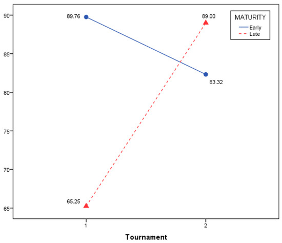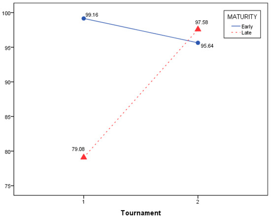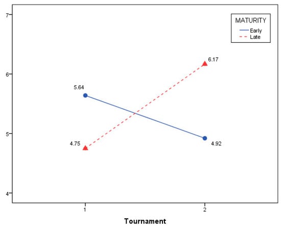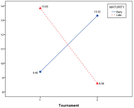 On the other hand, an interaction effect is observed in the tournament factor by maturity level. This is significant in the following variables: (a) Static Ball Obtained (F1,35 = 14.895, p = 0.000, η2 = 0.299); (b) Dynamic Ball Obtained (F1,35 = 7.193, p = 0.011, η2 = 0.170); and (c) Out-In Pass (F1,35 = 4.595, p = 0.039, η2 = 0.116). A tendency to significance was observed in the Ball Obtained variable (F1,35 = 3.495, p = 0.070, η2 = 0.091).