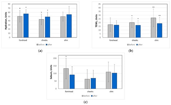 Instrumental measurements of skin hydration (a), TEWL (b), and sebum (c) before and after treatment. * p < 0.05, ** p < 0.01.