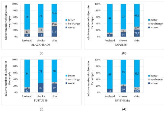 Percentage of subjects who declared improvement (blue), no change (grey), and deterioration (navy blue) in terms of skin lesions such as blackheads (a), papules (b), pustules (c), and erythema (d).