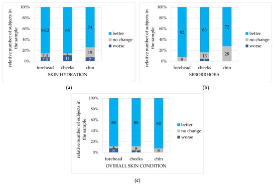 Percentage of subjects who declared improvement (blue), no change (grey), and deterioration (navy blue) in terms of skin hydration (a), seborrhea (b), and overall skin condition (c).
