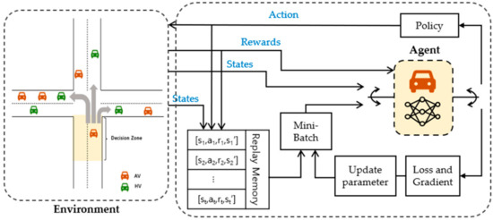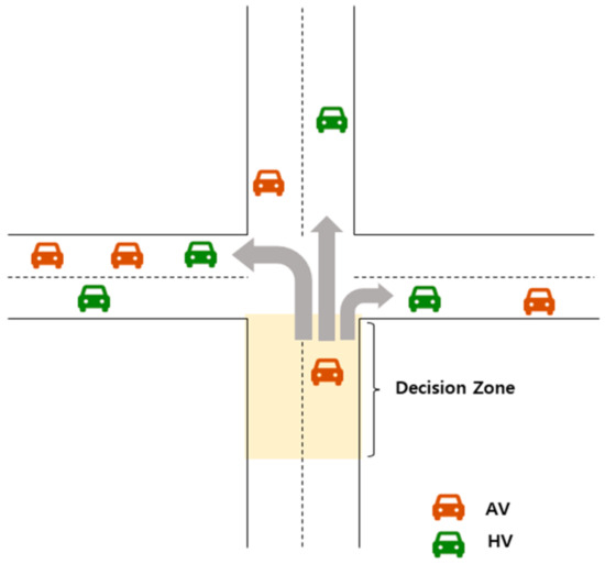 Figure 1, a decision zone with a specified distance was defined on the approach roads of each intersection. Within these zones, the driving direction of the AV at the intersection was determined. Therefore, when an AV is in the decision zone, it derives the observed state