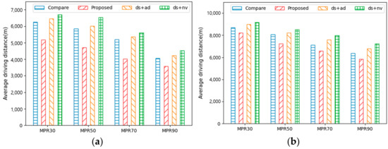 Figure 6a,b show the average driving distance for AVs to reach their destinations under different MPRs in City1 and City2, respectively. The MPR values are 30%, 50%, 70%, and 90%, thus indicating the ratio of AVs in a mixed traffic environment. For instance, MPR 90 comprises 90% AVs and 10% HVs in a traffic environment. The AVs learn to optimize their routes to the destination depending on the traffic situation; the higher the MPR, the lower the driving distance of the AVs. Therefore, as the MPR increases, the number of AVs learning the optimal route increases, thereby decreasing the driving distance to the destination. It is evident that the performance difference between City1 and City2 was relatively small. This was because it was less dynamic due to the fewer intersections and decision zones.