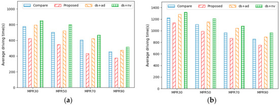 Figure 7a,b show the average driving time for AVs to reach their destinations under different MPRs in City1 and City2. The figures illustrate that the driving time decreases as the MPR increases. This indicates that the higher the number of AVs, the better the traffic flow. Additionally, the driving time is affected by both distance and speed, with shorter distances and higher speeds resulting in shorter driving times. Therefore,