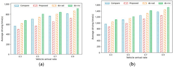 Figure 9a,b show the average driving time for AVs to reach their destinations under different vehicle arrival rates in City1 and City2.