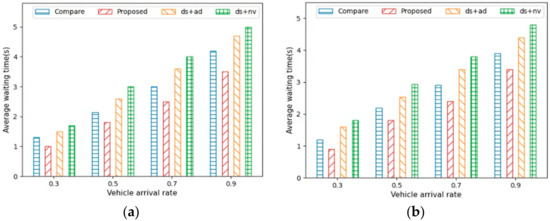 Figure 10a,b show the average waiting time for AVs under different vehicle arrival rates in City1 and City2. The figures indicate that the average driving and waiting times when the vehicle arrival rates (where the MPR value was 50%) were 0.3, 0.5, 0.7, and 0.9. As the vehicle arrival rate increased, the number of vehicles on the road also increased. This led to higher traffic density on the roads, thus resulting in increased traffic congestion. Consequently, the driving and waiting times for the AVs in City1 and City2 increased.