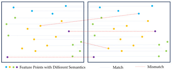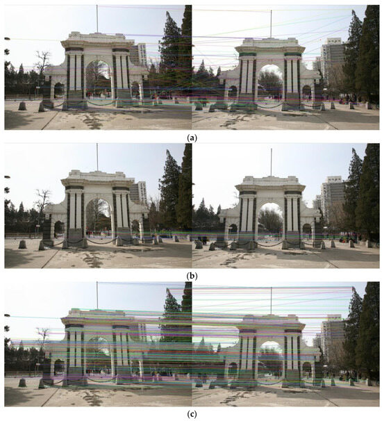 Figure 9. Semantic-based feature matching: (a) semantically inconsistent mismatched point pairs; (b) feature point matching pairs of dynamic targets in the scene; and (c) feature point matching results after semantic optimization.